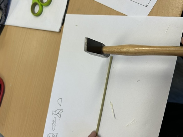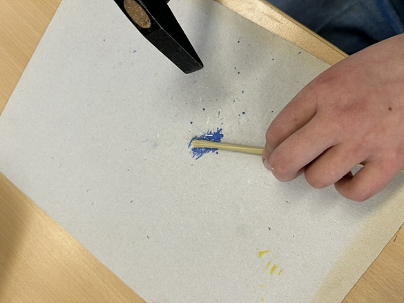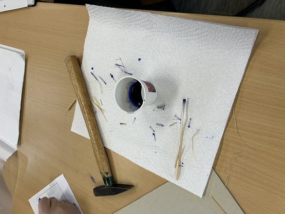 Also bekamen wir einen Binsenhalm. Diesen mussten wir an einem Ende mit einem Hammer platt klopfen, bis ein Pinsel entstand. Mit diesem selbst gemachten Pinsel und Tinte haben wir dann unsere Namen in Hieroglyphen geschrieben.
